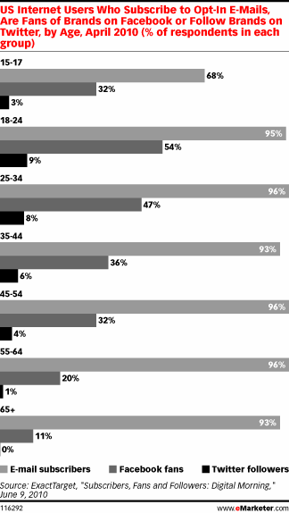 According to ExactTarget’s “Subscribers, Fans and Followers” report, most internet users engaged with brands only via marketing emails. They also found that there is significant overlap between the three channels and vast majority of social media fans or followers were also email subscribers. Nearly a third subscribed to emails in addition to being fans of brands on Facebook. (Source: How Are Email, Facebook and Twitter Audiences Different?
